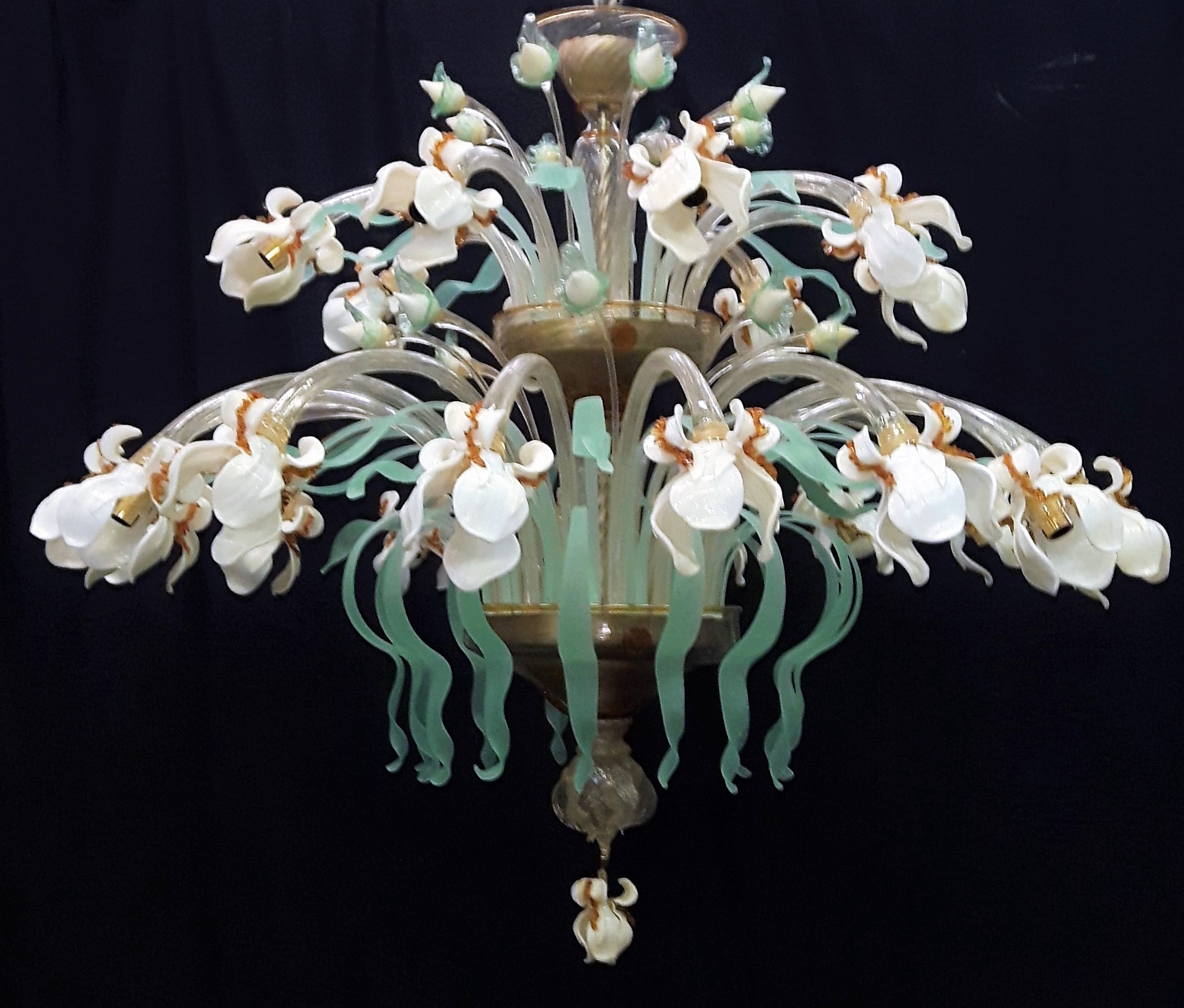 BELINA 24 lights from our Impressionism Murano Glass Chandelier line. This chandelier gives you the impression that the wind is blowing in your area and the irises are moving with the wind.