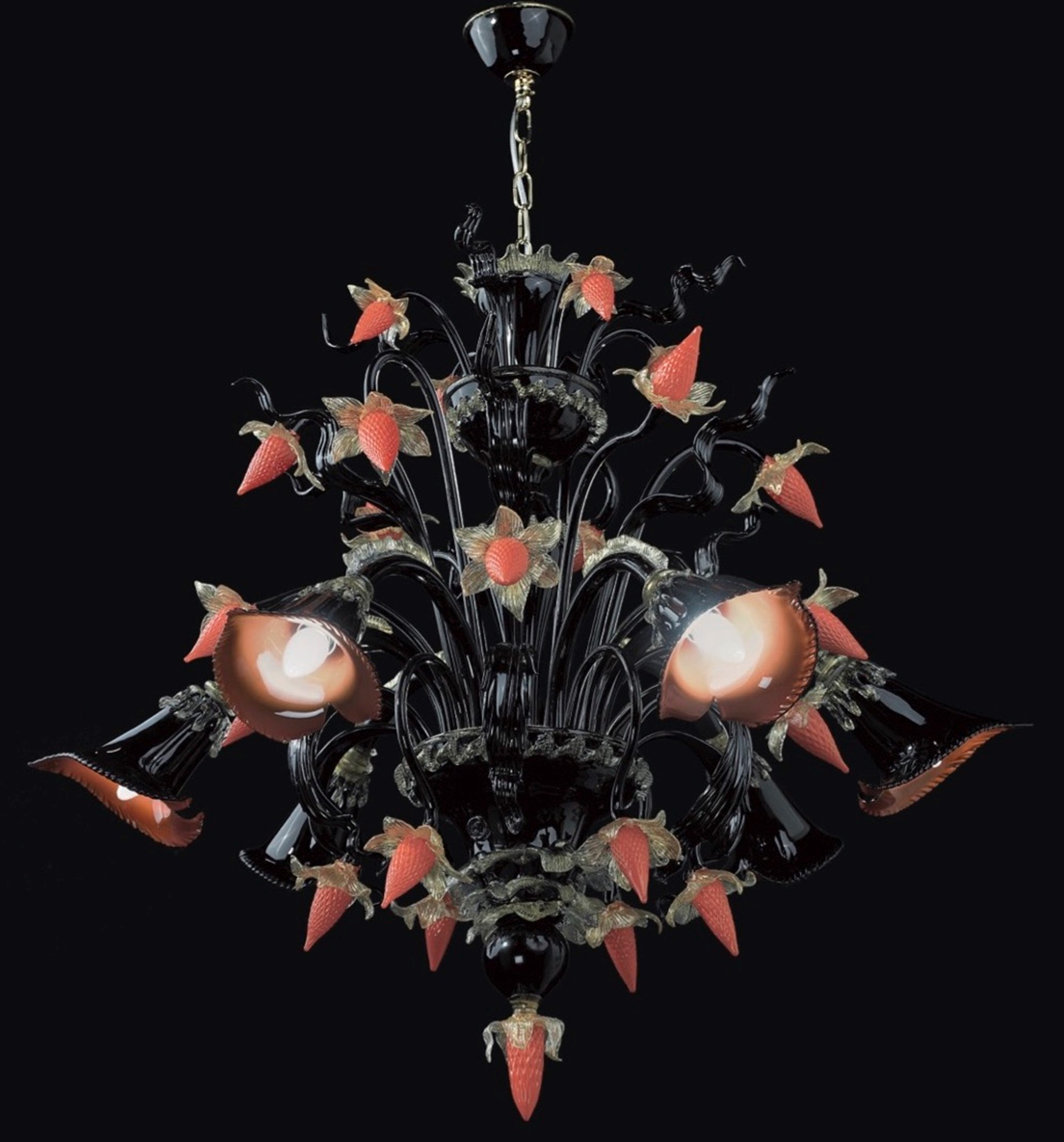 Fragola or strawberry from our Classic Murano glass chandelier line. This one is in 6 lights. Fragola evokes sweetness and pleasure. It is entirely hand made just for you by our Venetian glass masters. it is fully customizable.