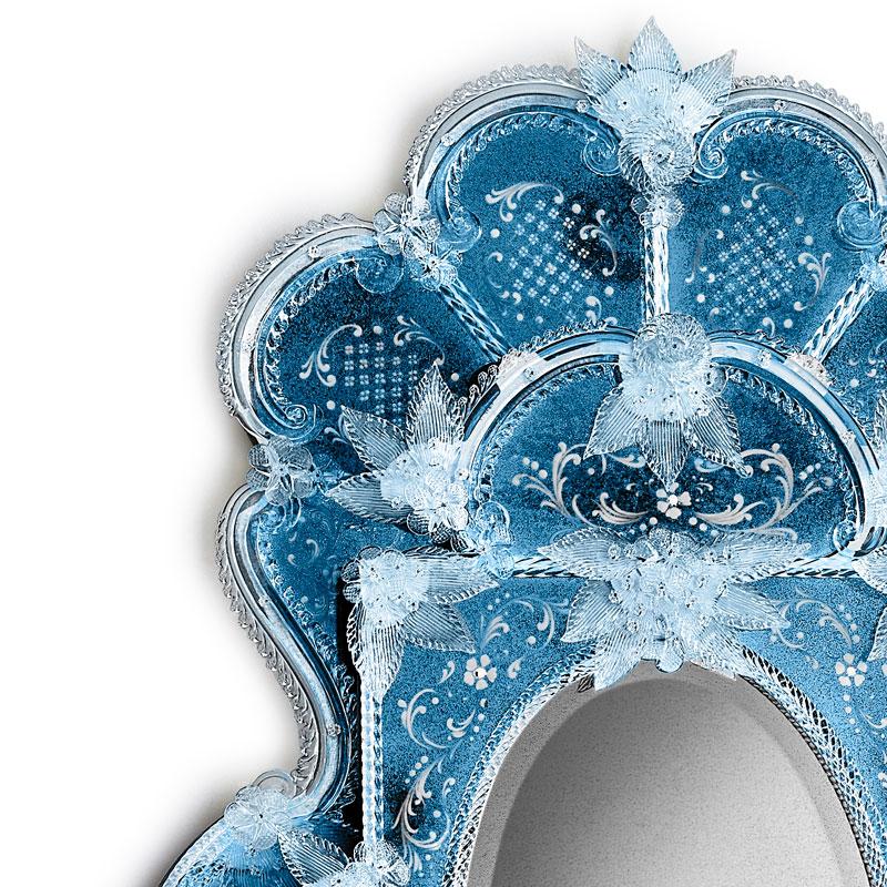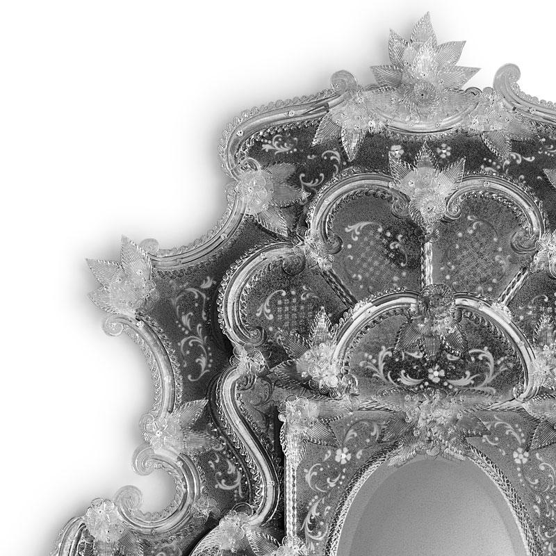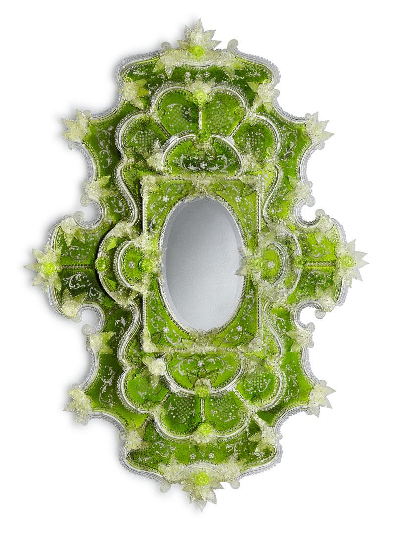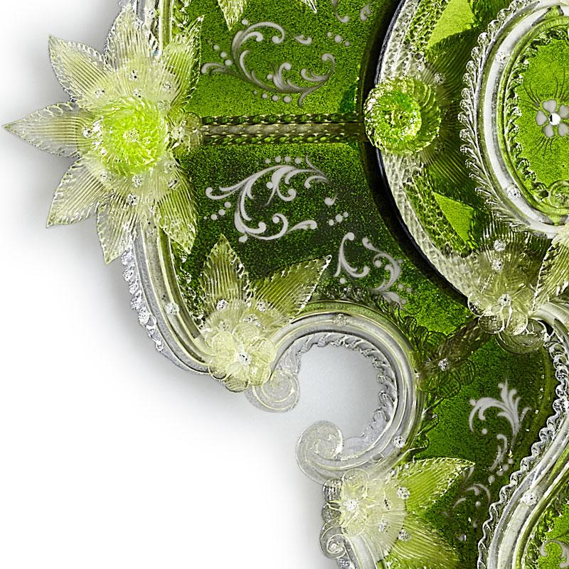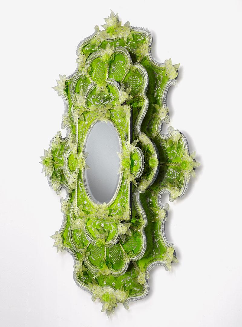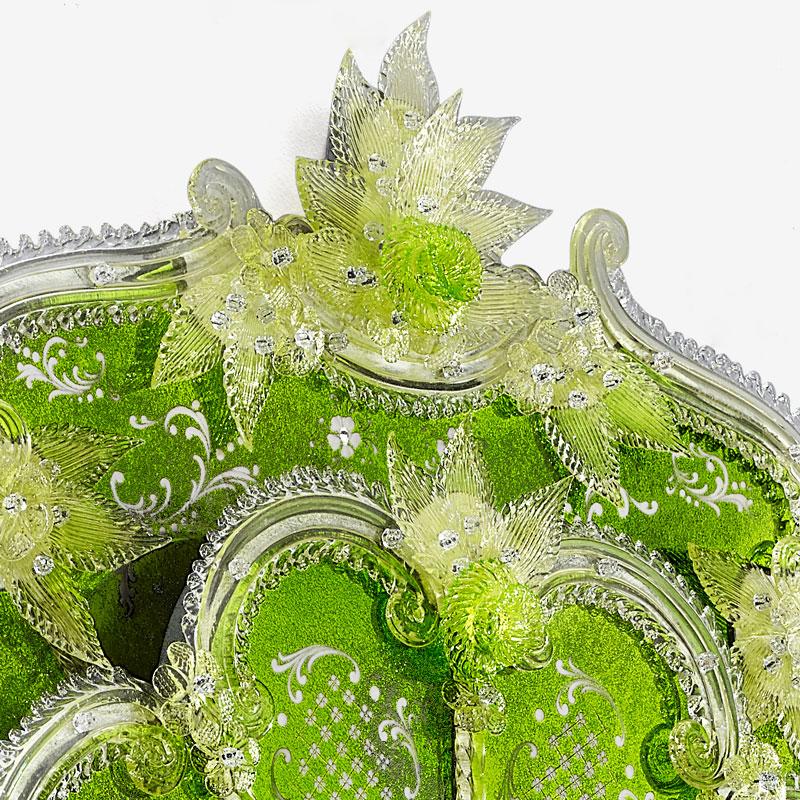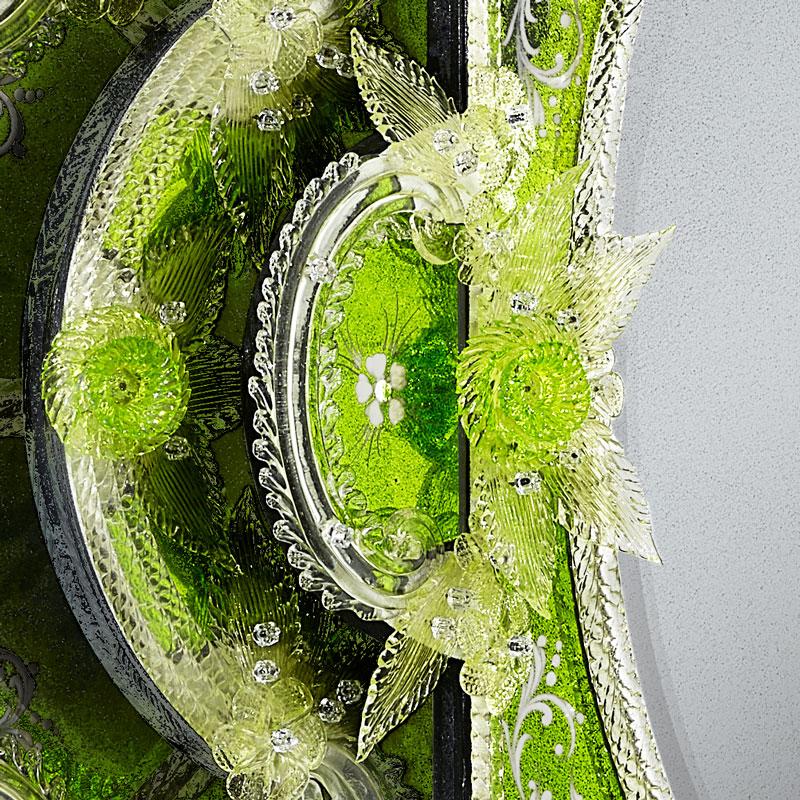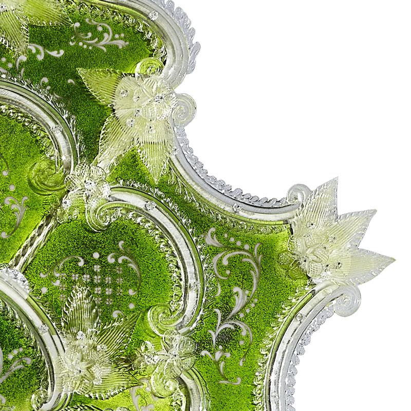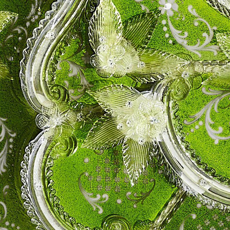 Decorative leaves, curls and rosettes made of crystal-green colored Murano glass.