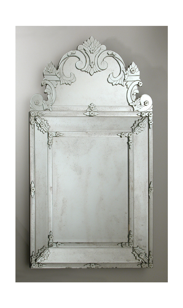 These mirrors consist of detached glass elements that together form frames and ornamental additions, simulating blown glass curls or leaves, but only flat.