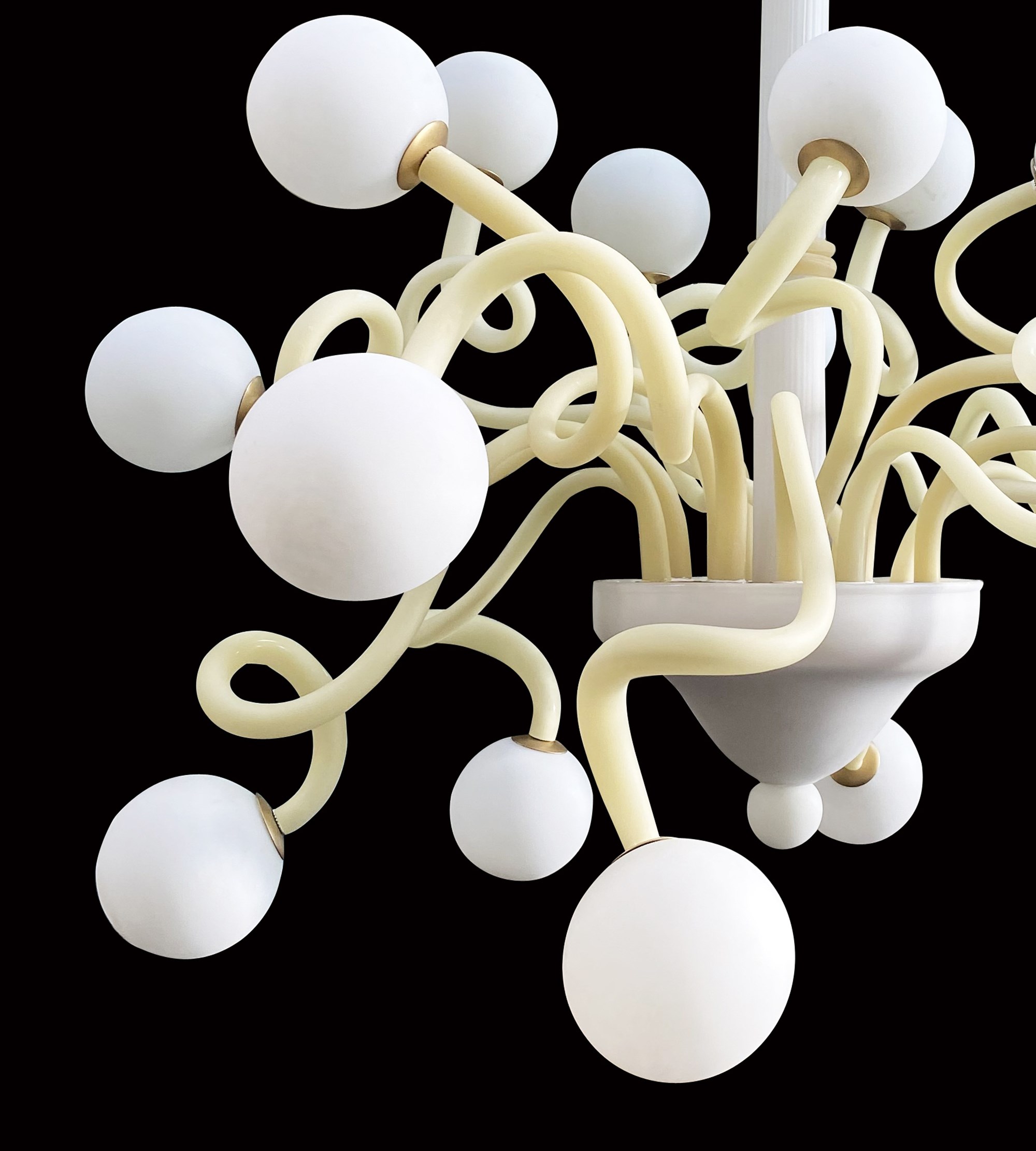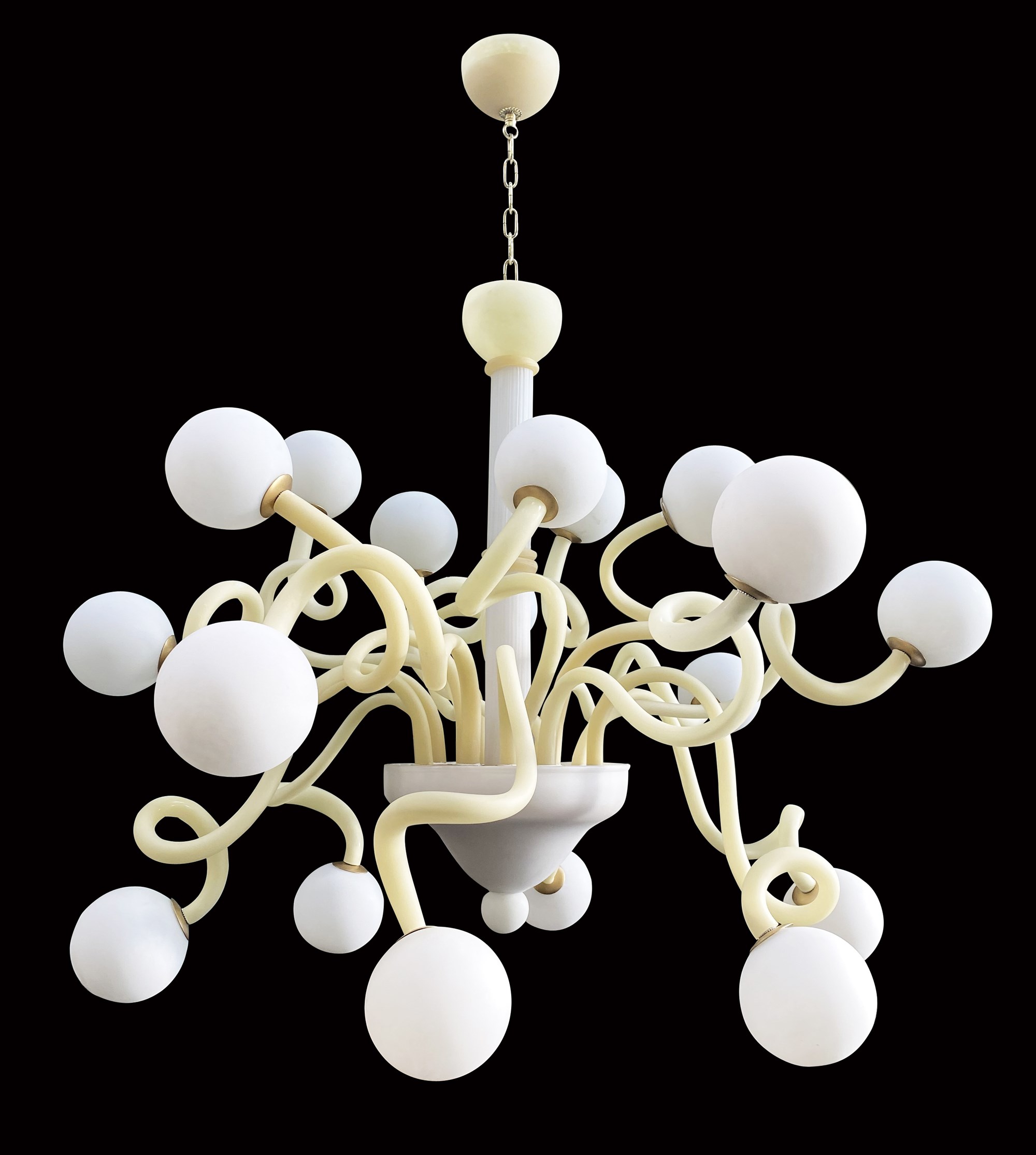 The modern Sfere chandelier is an unique creation, ideal for decorating your rooms with style and elegance. It is made of sandblasted effect ivory glass with sandblasted effect white glass spheres.