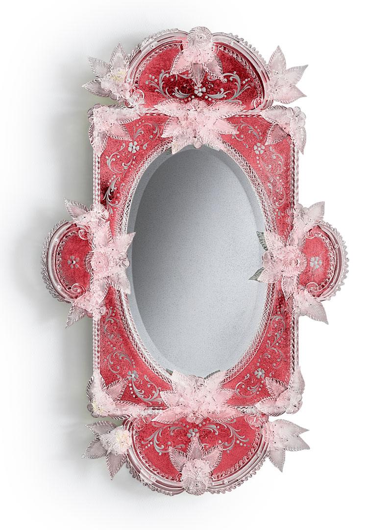 Mirror made of two levels, Venetian engraved glass with strawberry red varnished and medium antiqued mirrored finish.