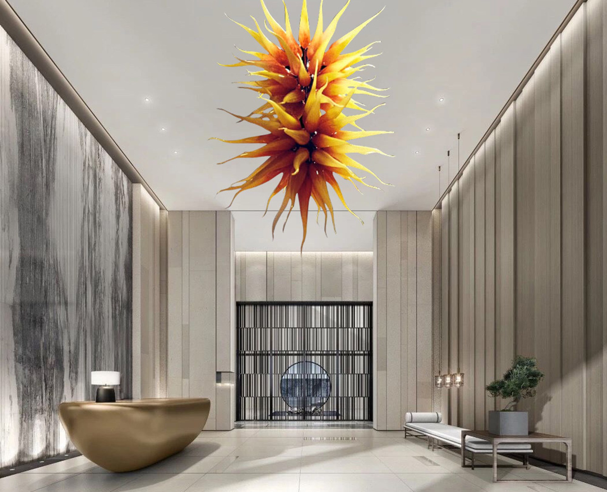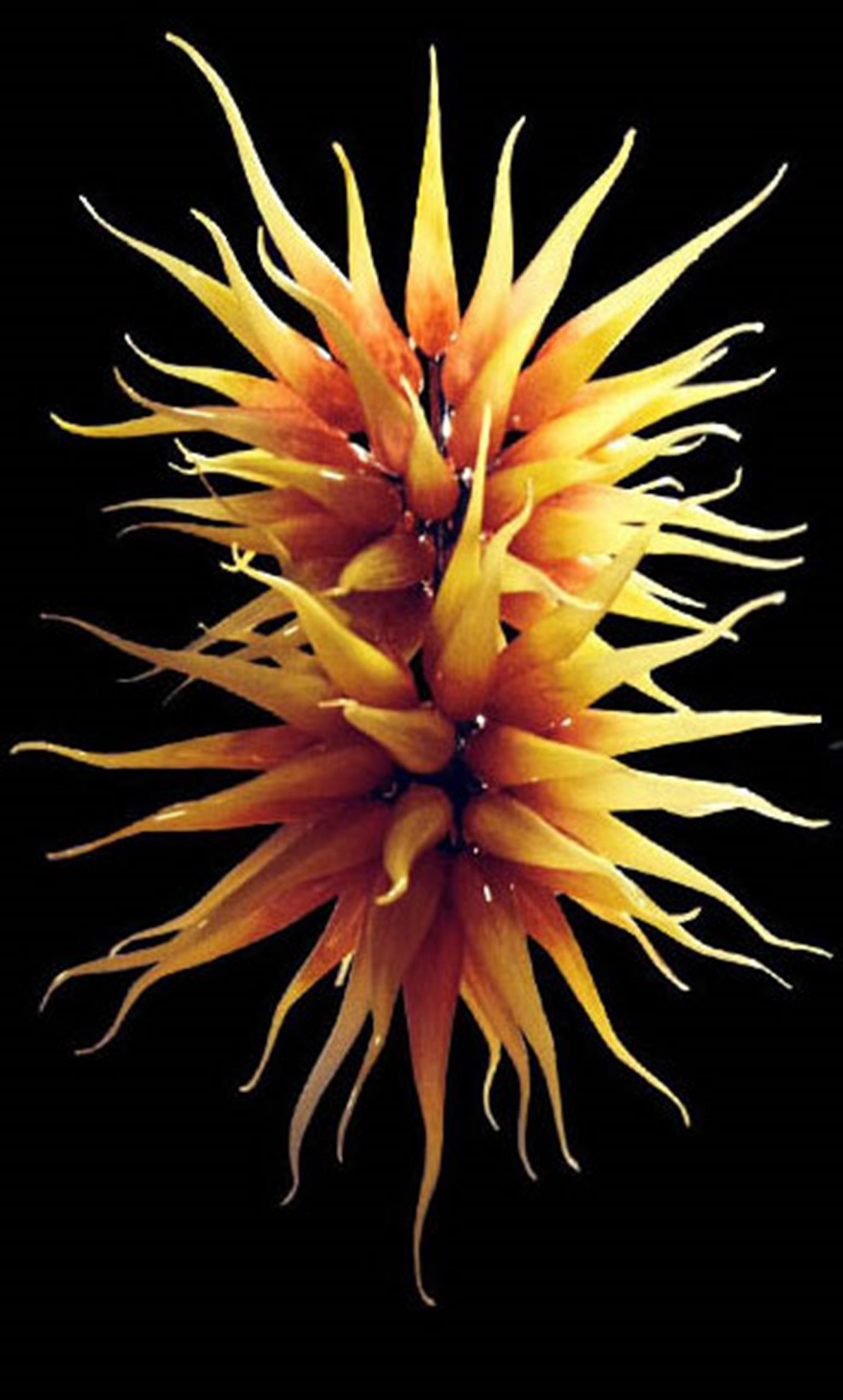 The modern Soffione chandelier has a particular structure consisting of a central “body” to which the glass “flames” are screwed. The flames have a faded color from yellow to red (from the tips towards the center).
