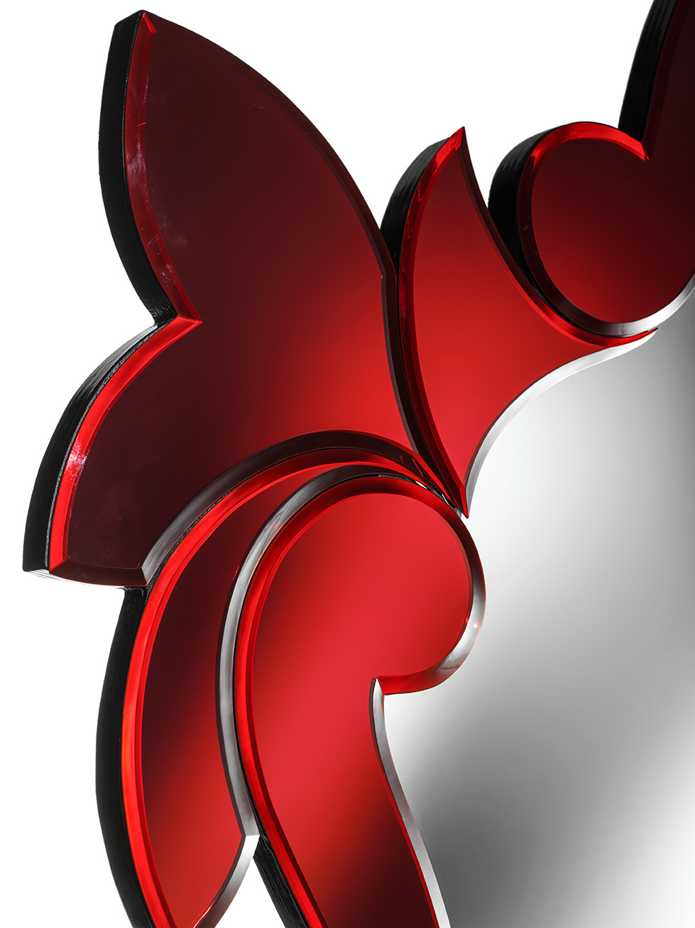 These mirrors consist of detached glass elements that together form frames and ornamental additions, simulating blown glass curls or leaves, but only flat.