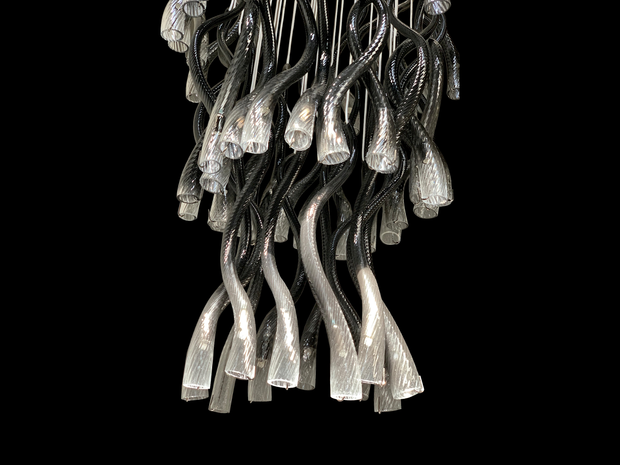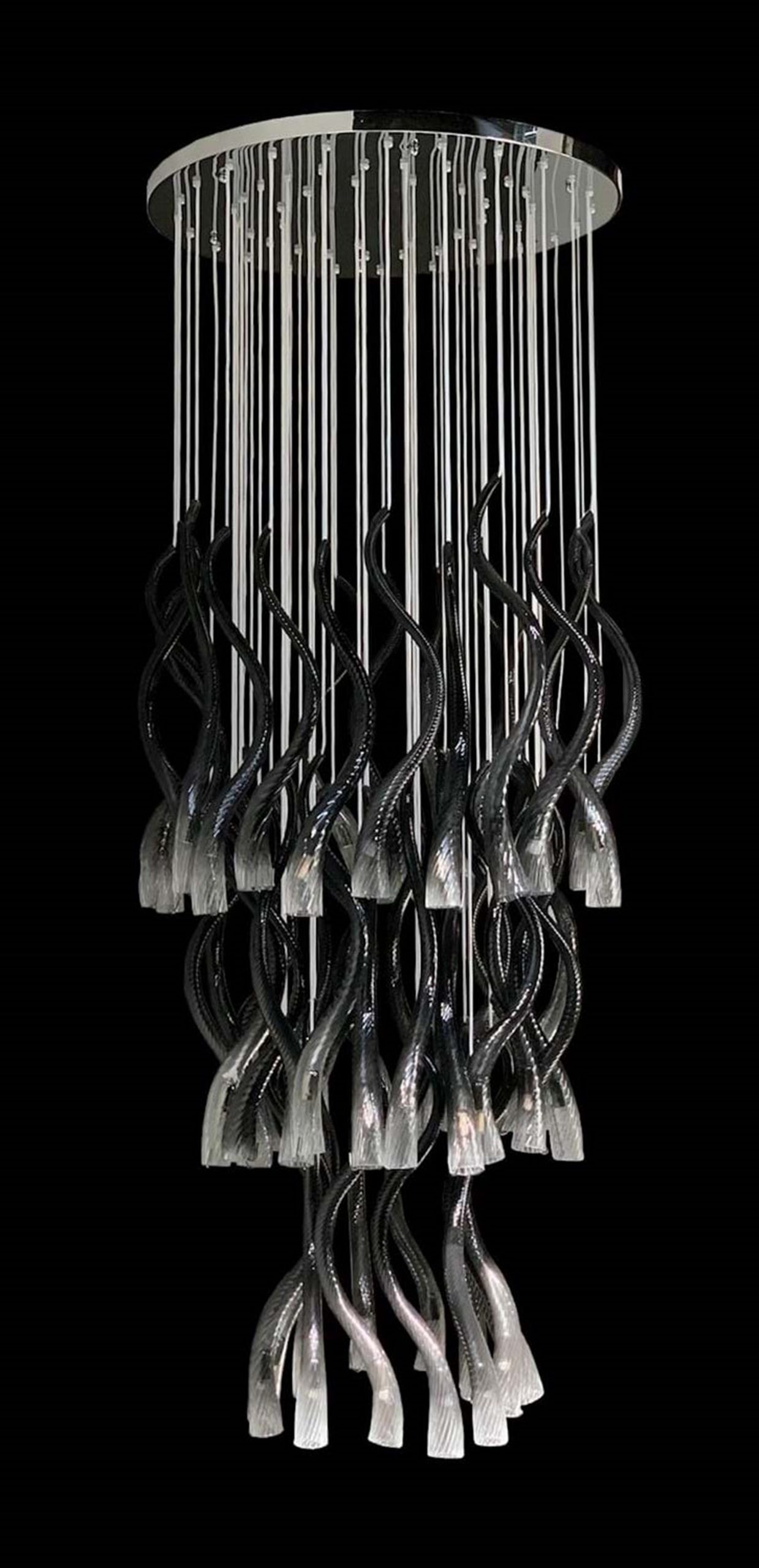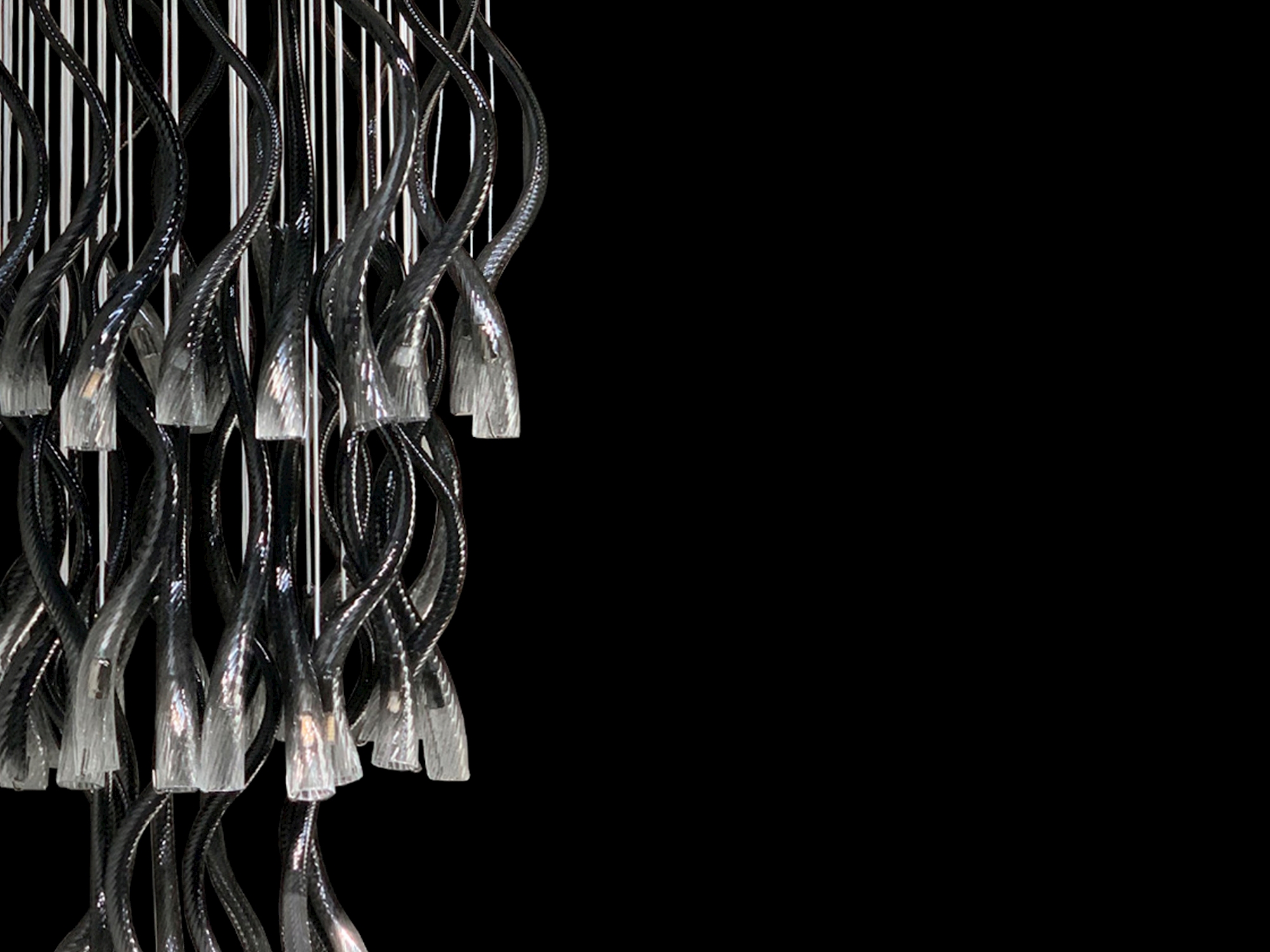 The spirals twirl in the air, wrapped in a dark shade that is lightened by painting itself in a pure white, a stamp of modern lighting.