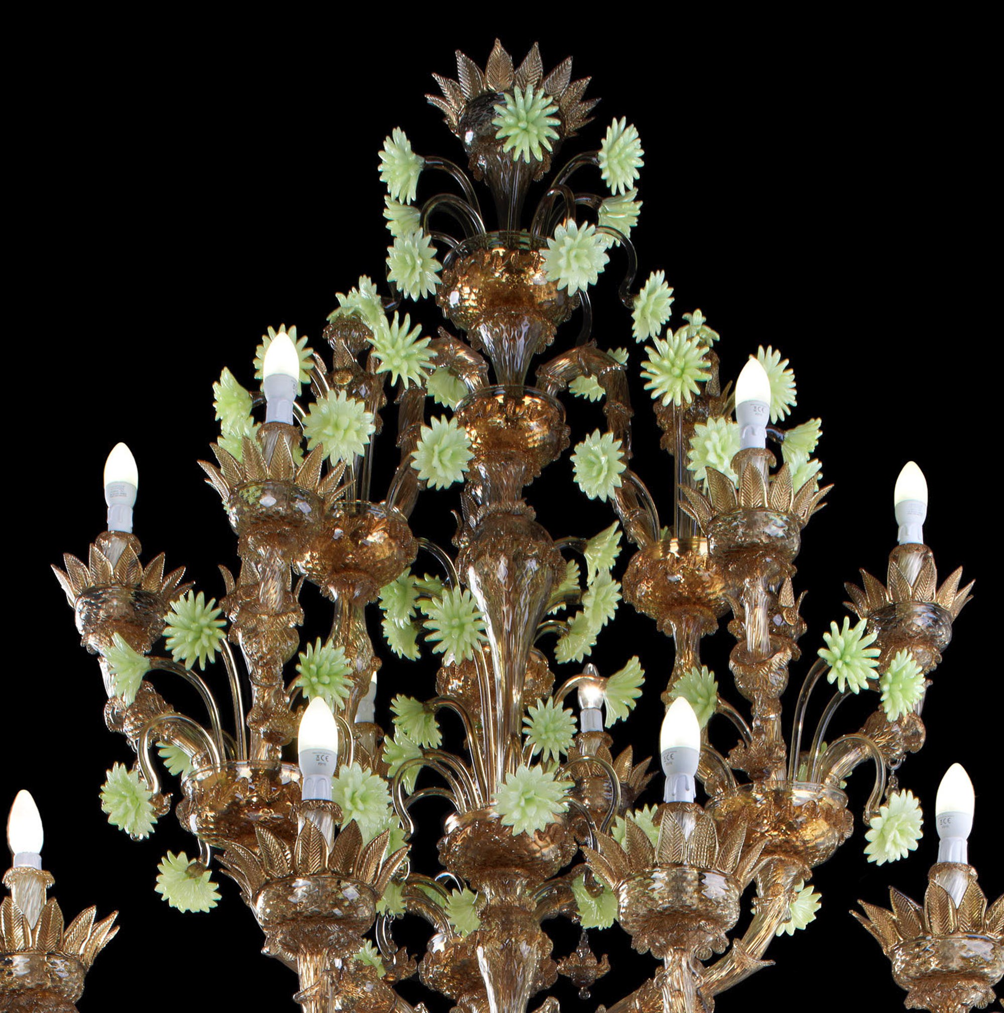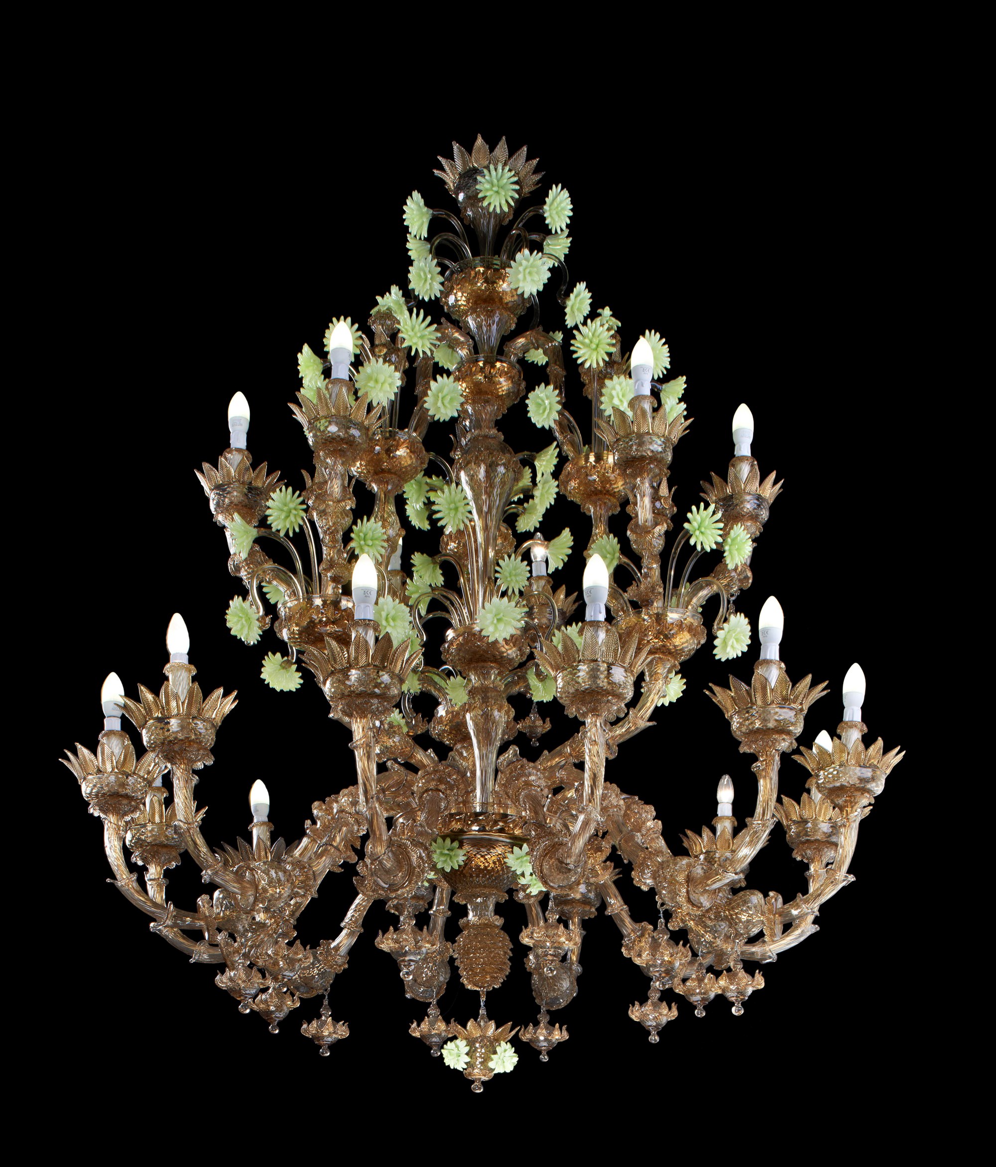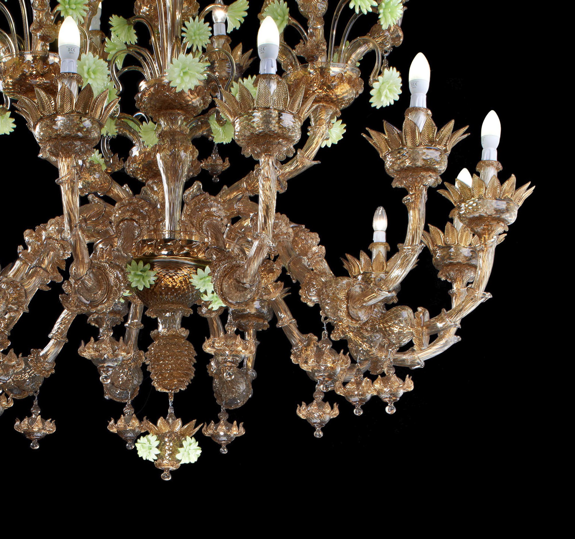 The Stella chandelier is a majestic and elegant Ca ‘Rezzonico model, entirely made of dark amber with acid green paste flowers. From the design to the actual creation, everything is done by hand by our Murano glassmasters