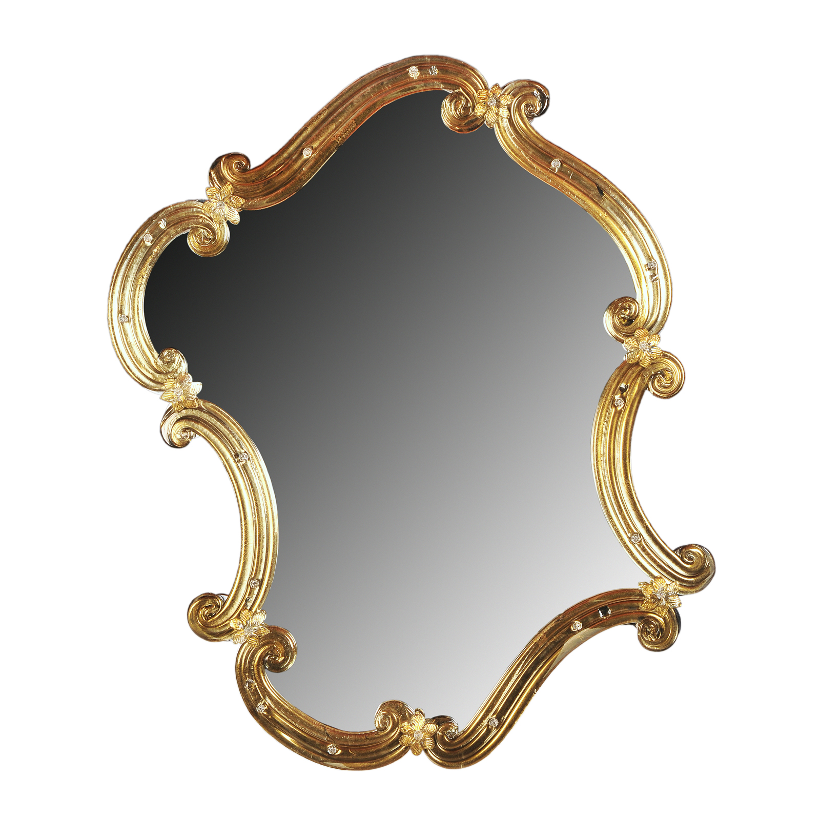 This is our serie of Storti co l’oro, handmade mirrors realized with great technique: from its glass curls with their wiggly form and enriched by precious gold leaves to the wood. Perfect for the most sought after space, surprising thanks to its irregular but harmonious shapes. The graceful and sinuous curls which give it a modern but extremely refined look and the different colors that can be used as gold, blue and gray.