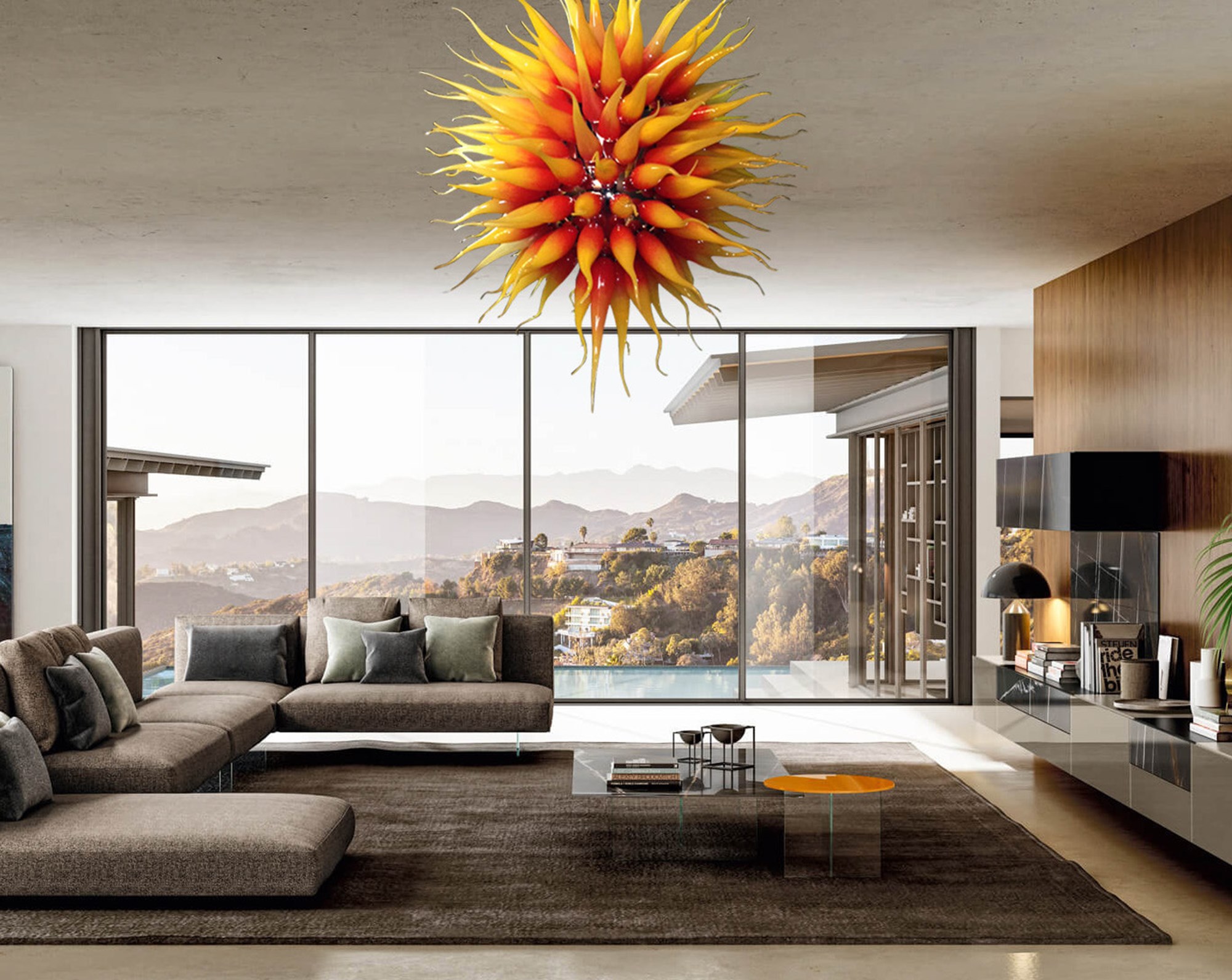Thanks to the faded red color of each flame, the final visual impact alludes to a real “sun” and ensures a magnificent look for its modern lighting, both when the chandelier is on and when it is off. Captivating design that adapts to modern environments, giving them contrast, refinement and elegance, thanks to the versatility of its lines.