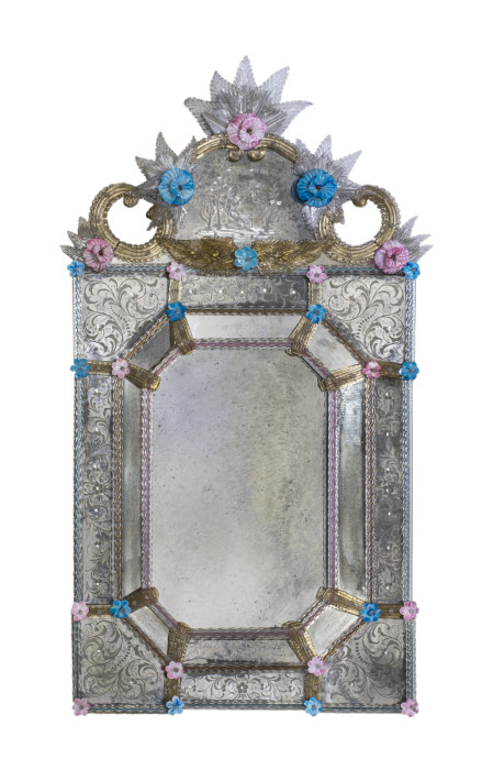 The great expertise of the master glass-workers in Venice brought tothe creation of structural and stylistic solutions with the use of countless decorative elements of blown glass. Influenced by Baroque style the mirrors became soon a jubilation of curves, spirals and crystal details, which transparency and sparkle that were smartly used to cover the rough glass cuts or the wooden framework supporting the artefact.