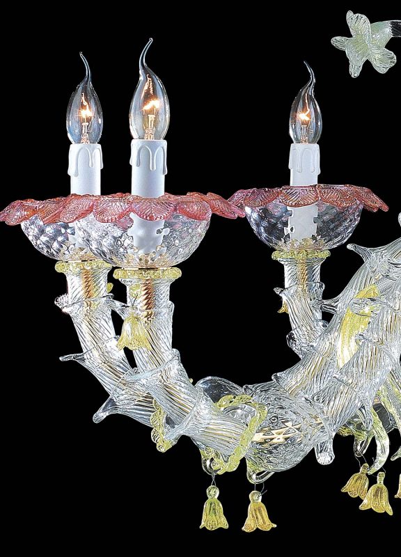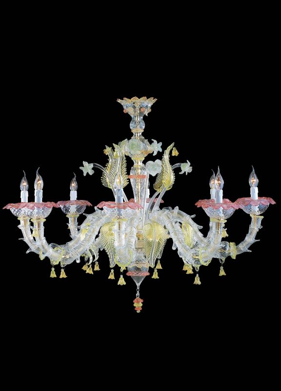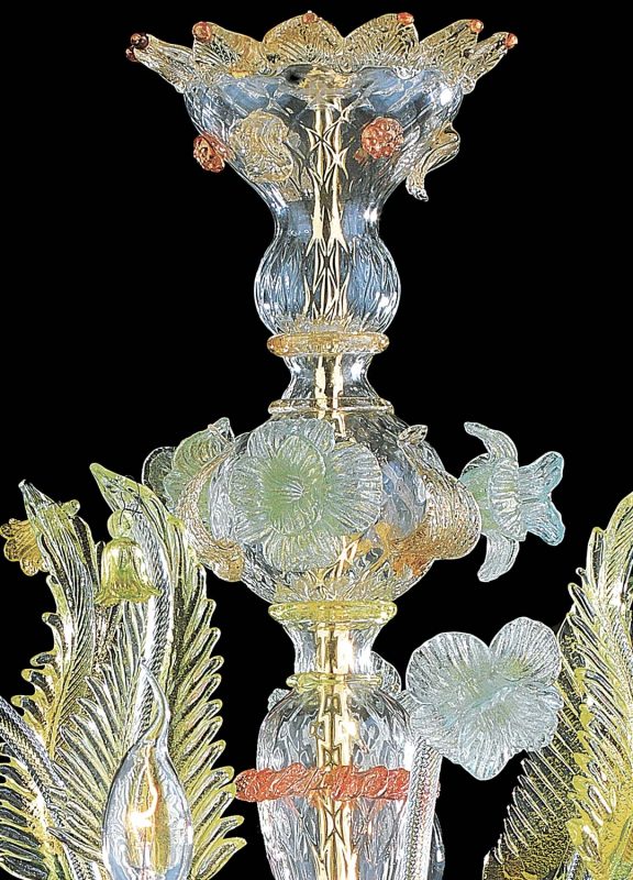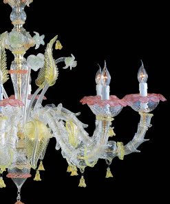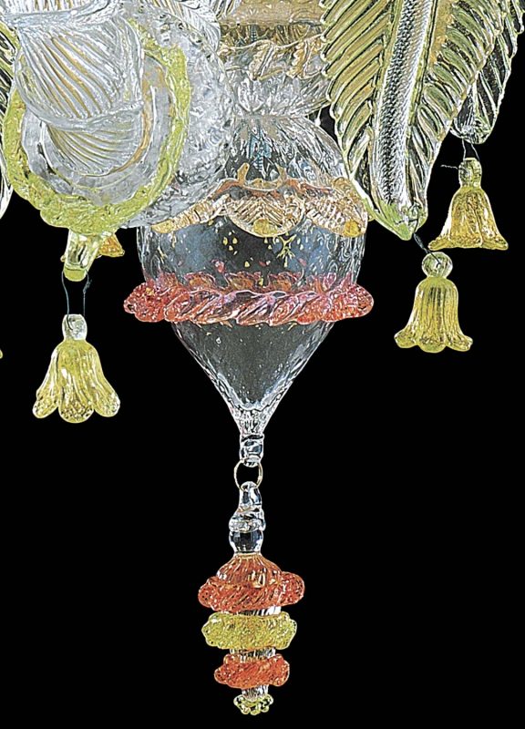 Murano glass chandelier in “Rezzonico” style, is the ideal combination of art and elegance. The amber color gives a bright and unique touch to the chandelier, the lampshades aim to diffuse the light throughout the room.
